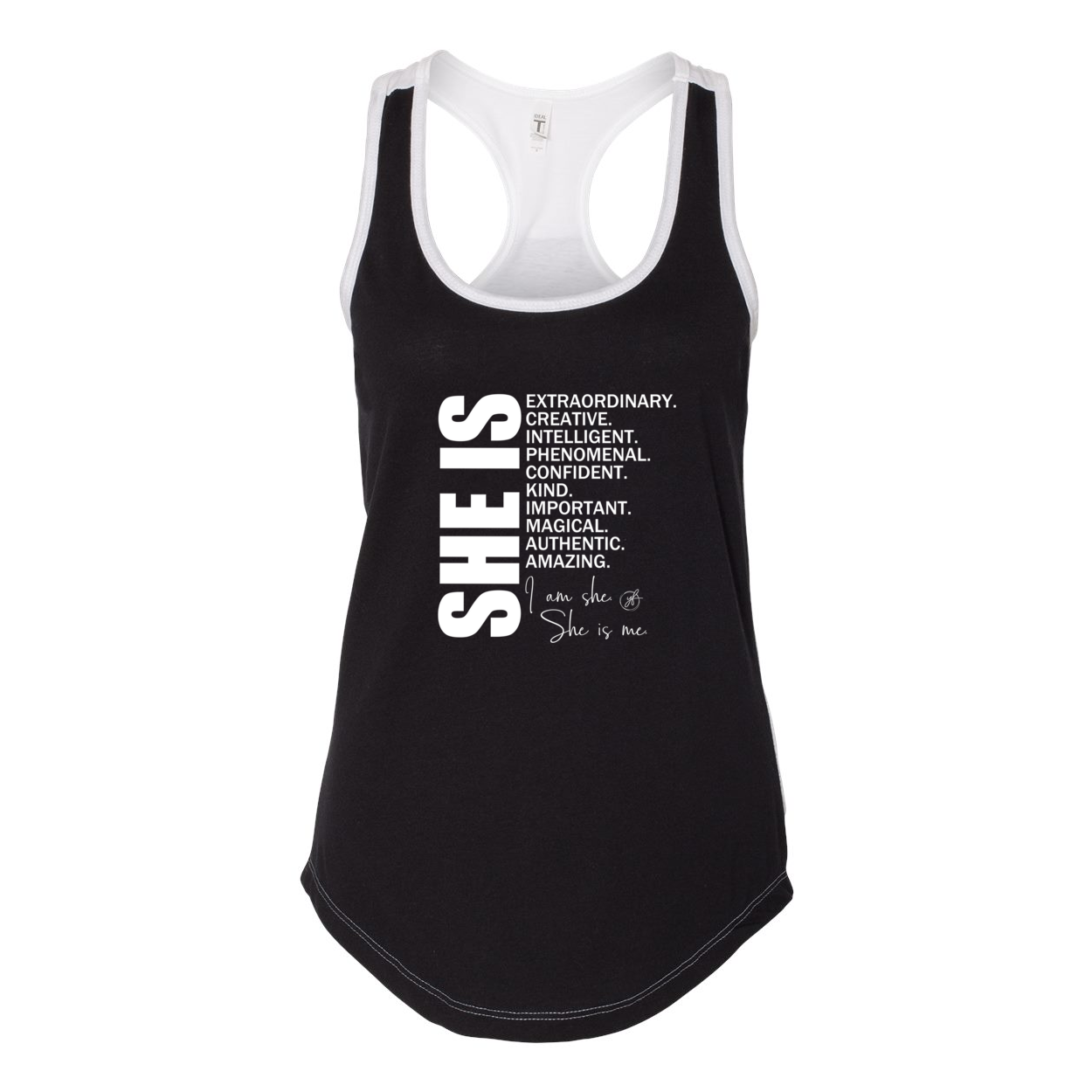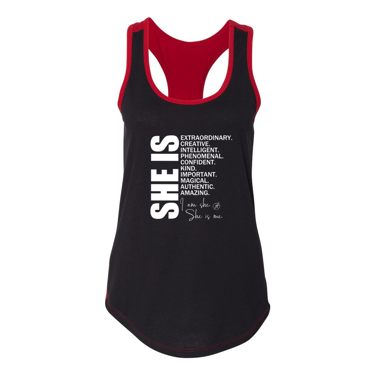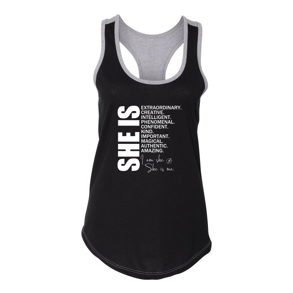 YOLO FITTED'S "SHE IS....." RACER BACK TANK